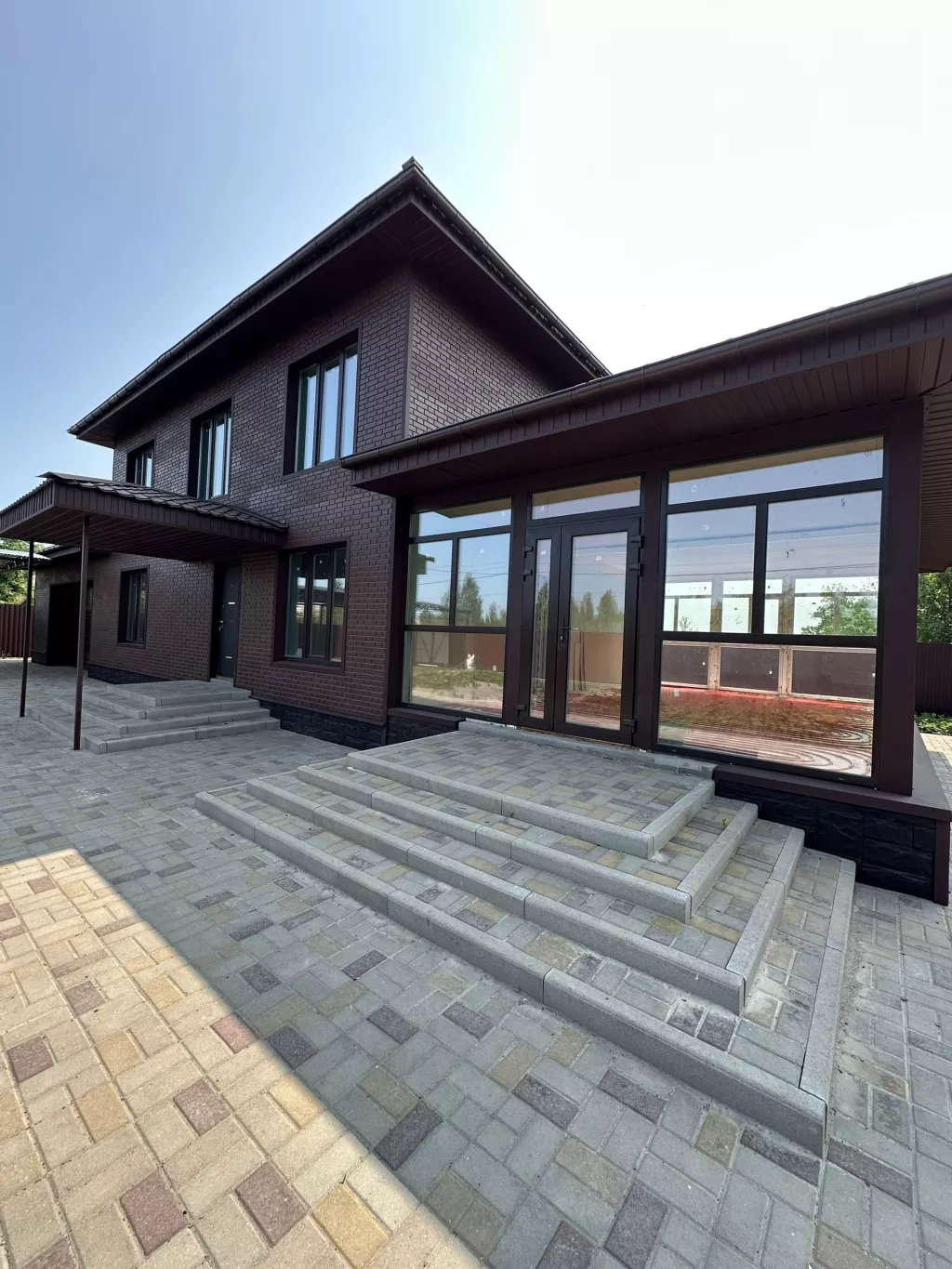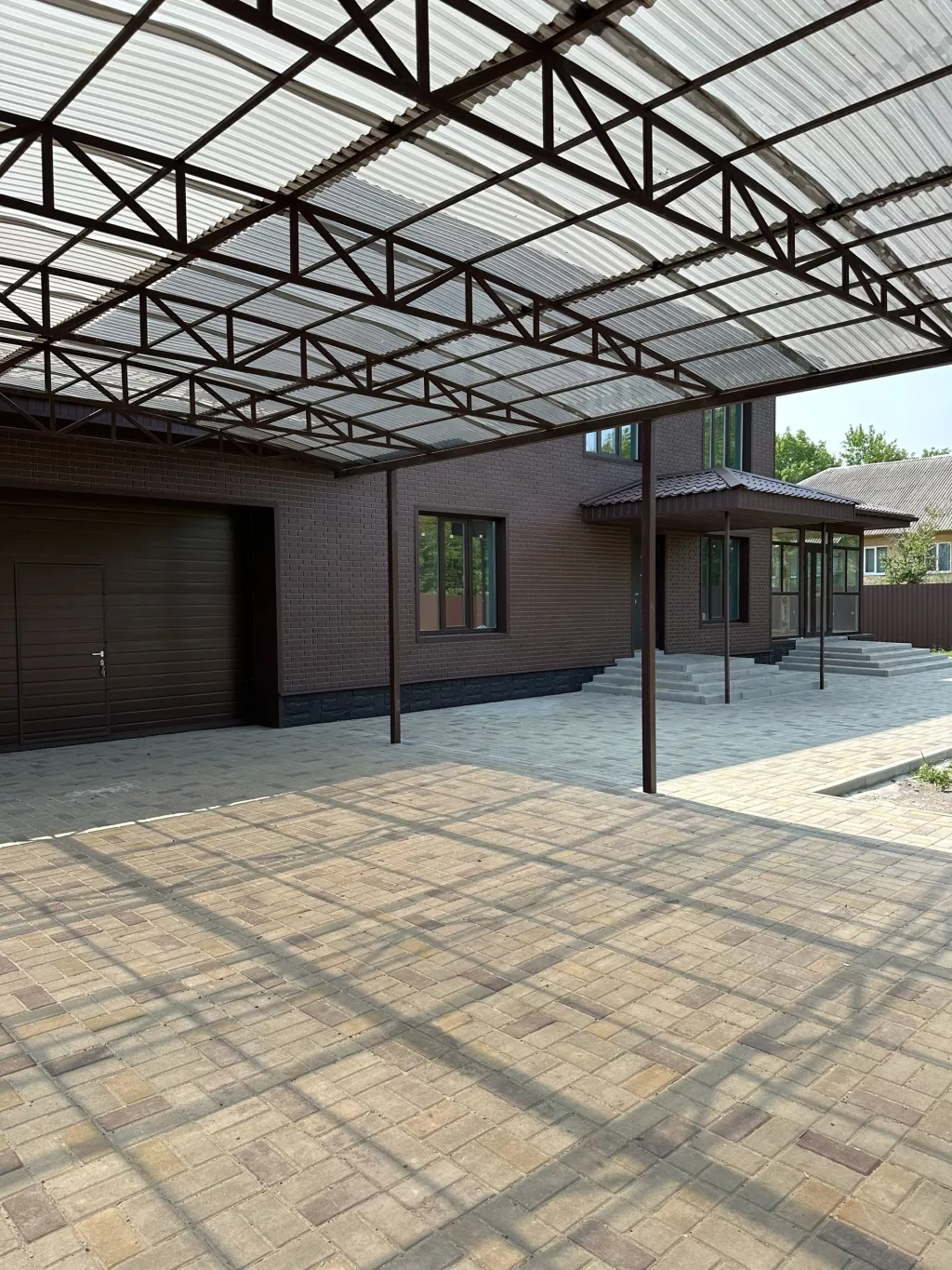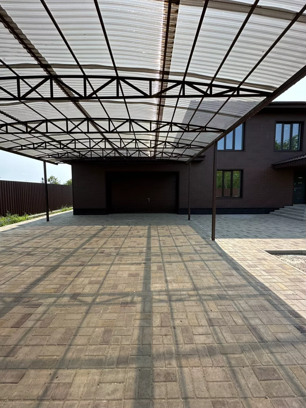 Дом каркасного типа. Двор полностью вымощен фем.плиткой. Обнесён забором по всей территории. Крыша металлочерепица Фасад сайдинг, современный дизайн.